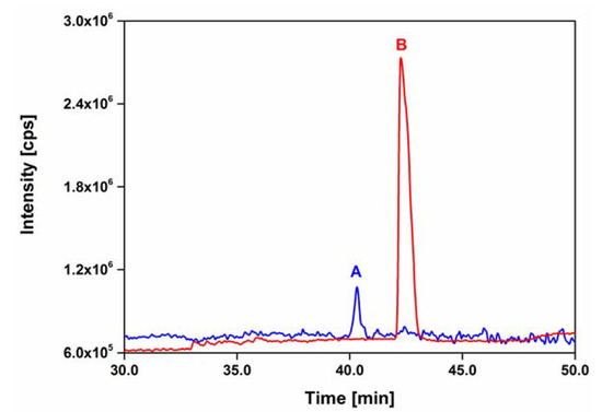 In order to analyze the anions in ILs, several CE conditions such as buffer composition, pH value, temperature, and applied capillary voltage were optimized. Since the CE was hyphenated to the ESI-Q-TOF-MS, it was essential to use a volatile buffer for the separation of the anions. Two volatiles buffers were tested for the detection of the TFSI− anion, 40.0 mM ammonium formate buffer (A) and 50.0 mM ammonium acetate buffer (B) (Figure 1). Both peaks A and B, had a m/z ratio 279.9173 corresponding to the anion TFSI−. The concentrations and sample preparations of these two samples were identical. The peak intensity using the ammonium acetate buffer was higher than using the ammonium formate buffer, by a factor of 10. As a result, further optimization measurements were carried out using the ammonium acetate buffer.