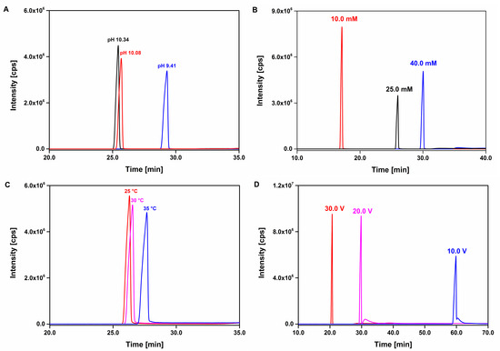 Electropherograms showing the TFSI− peak using an acetate buffer during method development: (A) measured at different pH values; (B) measured with different concentrations of the acetate buffer; (C) measured at different temperatures and (D) measured under different applied voltages.