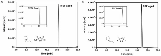 In Figure 3B, one peak at a migration time of 22.5 min and a m/z ratio of 179.9238 was detected. In Figure 3B, the inserted figure shows the measurement of the fresh sample. The calculated m/z ratio of the FSI− was 179.9242. Accordingly, the deviation was 2.38 ppm. This peak was attributed to the FSI− anion aged at 60 °C. The same m/z ratios were also detected for the samples aged at room temperature. Overall, no decomposition products were observed. These results confirmed the stability study by Pyschik et al. in which the ILs were investigated by the hyphenation of ion chromatography and mass spectrometer [29]. Decomposition products were only detected for the FSI− anion mixed with the conductive salt lithium hexafluorophosphate or lithium perchlorate. No decomposition product of the TFSI− anion were observed [29]. Since no internal standard was used during the measurements, it was not possible to note changes in the areas.