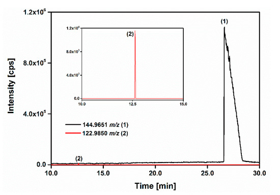 The electrolyte was aged at 60 °C for one month mixed with PS and with one of the following OPs: DMP, DEP and TEP. PS is a commonly used electrolyte additive in LIB electrolytes. DMP, DEP and TEP are possible decomposition products from the reaction of the lithium salt with the carbonates and are also used as flame retardants in LIB electrolytes [51]. As reference sample, the electrolyte was also aged without additive and without OPs. In Figure 4, the electropherogram of the reference sample is shown. Beside the detected m/z ratio of PF6− (1), the decomposition product (2) with the m/z ratio of 122.9853 was determined at 12.6 minutes (see inset). In Table 1, all calculated and measured m/z ratios as well as the deviations and the related structures of the formed decomposition products mentioned in this part are given. Most of the deviations were in the range of 3 ppm. The combination of temperature and short storage time showed a slight aging of the electrolyte.