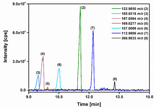 In Figure 5, the electropherogram of the detected m/z ratios in the aged electrolyte sample with DMP and PS is shown. For a better overview, the peak of PF6− is not shown in the electropherogram. It is interesting that no m/z ratio of DMP was detected in the aged sample. Accordingly, DMP reacted completely to other decomposition products from the electrolyte mixture. The following OPs were determined in the aged sample: (2) 122.9850 m/z (3) 185.0218 m/z, (4) 197.0584 m/z, (5) 169.0277 m/z, (6) 157.0069 m/z, (7) 112.9806 m/z, and (8) 266.9833 m/z. Kraft and Weber et al. investigated this electrolyte by IC/ESI-MS and gas chromatography (GC)-MS and described the formation of several OPs in aged electrolytes [37,41,43,44,45,46]. In the electropherogram (Figure 5), some of the reported m/z ratios were detected. The advantage of the applied CE method is the baseline separation of the OPs without using a non-commercially available two-dimensional setup [46]. The two-dimensional IC technique with heart-cutting mode was developed to separate the ionic OPs from each other. On the first dimension, the OPs were pre-separated from the hexafluorophosphate anion, then the analytes were retarded on a preconcentration column and separated isocratically on the second dimension. Different stationary phases and eluents were used on the second dimension as compared to the first dimension [46]. The fluorinated decomposition product (8) with the m/z ratio of 266.9833 was formed by reaction of two OPs. Relating to this, Matsumoto et al. reported the polymerization of trimethylphosphate in LIB electrolytes [52]. However, the structure of the decomposition products formed by two OPs should be cleared by further structural clarification methods like nuclear magnetic resonance (NMR).