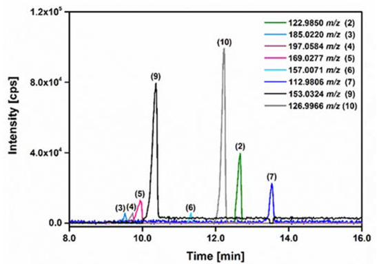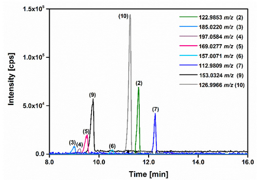 In Figure 6, the electropherogram of the determined m/z ratios from the mixture of the LIB electrolyte, PS and DEP (9) is illustrated. Beside DEP (9), the decomposition products (2–7) were the same as in the previous sample. Additionally, the m/z ratio of 126.9966 (10) was detected in this sample. This decomposition product was related to 2-((fluoro(2-(phosphonooxy)ethoxy)phosphoryl)oxy) ethanolate.