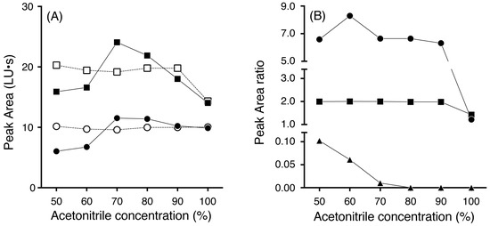 Effects of acetonitrile concentrations on the reaction efficiency of DBD-H. The effect of acetonitrile concentration and reaction time on the DBD-H derivatization reaction (A). Symbols: ○ 0.05 mM anisaldehyde and □ 0.025 mM TPC reacted for 60 min; ● 0.05 mM anisaldehyde and ■ 0.025 mM TPC reacted for 120 min. The effect of acetonitrile concentration on extraction and DBD-H derivatization reaction (B). Symbols: ● 10 mg of takuan-zuke, ■ 0.025 mM TPC, ▲ 0.025 mM MTB-ITC.
