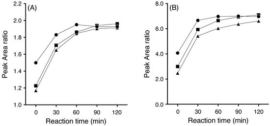 Uzu et al. reported that the reactivity of DBD-H increased in proportion to the concentration of acetonitrile [14]. The reactions of TPC and anisaldehyde (I.S.) with DBD-H in 50–100% acetonitrile were investigated. Reaction conditions were 0.025% DBD-H and 0.025% TFA for 60 to 120 min at 25 °C. As shown in Figure 3A, the derivative reaction lasting for 2 h occurred at a sufficient level for all acetonitrile concentrations, but the reaction for 1 h was insufficient for 50% to 60% acetonitrile.