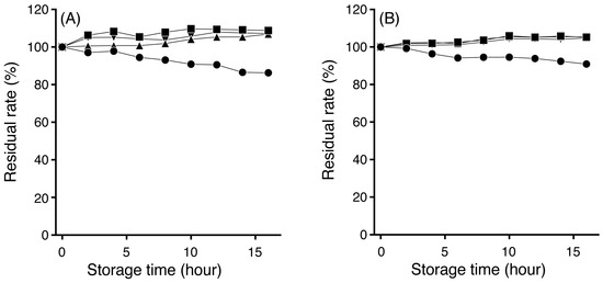 Effects of buffer pH on the stability of TPC. (A) 0.1 mM TPC standard solution; and (B) 10 mg of takuan-zuke sample. Symbols: ● No addition of buffer, ■ pH4 McIlvaine buffer, ▲ pH5 McIlvaine buffer, ▼ pH6 McIlvaine buffer. The residual ratio was represented by the peak area ratio when the peak area value immediately after the reaction was taken as 100%.