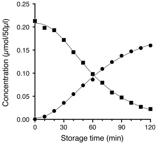Time-dependent changes in TPC and MTB-ITC in grated radish juice were analyzed (Figure 7). MTB-ITC was rapidly formed during radish grinding and decreased in a time-dependent manner from the maximum concentration of 213.0 nmol/50 µL of grated juice. The TPC in grated radish juice increased with time; the concentration was 0.5–160.0 nmol/50 µL. The results showed that about 75% of MTB-ITC was converted to TPC in only 120 min. In addition, the cumulative value of MTB-ITC and TPC after 120 min was 182.4 nmol/50 µL, which was 85% of the initial value of MTB-ITC. A strong negative correlation between TPC and MTB-ITC was revealed (y = −1.20 x + 211, r2 = 0.997) in linear regression analysis. These results revealed that TPC is the major degradation product of MTB-ITC. The findings of this study show that this analytical method can be applied not only to takuan-zuke, but also to processed radish products, with potential utility for evaluating the quality of such items.