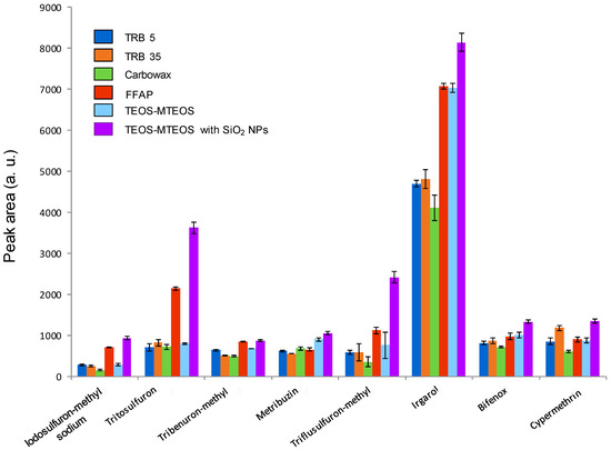 In order to check if the increment on peak areas obtained with the SiO2 NPs modified TEOS-MTEOS coating were significantly different from those achieved with other coatings, a t test was applied. For this purpose, t was calculated for the two coatings that provided the highest peak areas for each analyte. In other words, the peak areas obtained with the SiO2 NPs reinforced TEOS-MTEOS coating were compared with the areas obtained with the FFAP coating for iodosulfuron-methyl-sodium, tritosulfuron tribenuron-methyl, triflusulfuron-methyl and irgarol, with the TEOS-MTEOS coating for metribuzin and bifenox, and with the TRB 35 coating for cypermethrin (Figure 1). The tcalculated values were higher than the ttabulated at 95% confidence level except for tribenuron-methyl (tcalculated = 1.485; ttabulated = 2.365). This means that the SiO2 NPs-TEOS/MTEOS coating provided statistically different (higher) peak areas, except for tribenuron-methyl.
