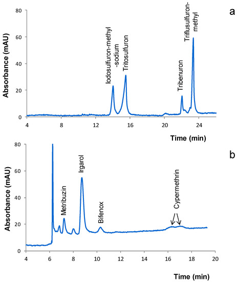 Chromatograms obtained under the proposed conditions for standard solutions of the analytes: (a) iodosulfuron-methyl-sodium, tritosulfuron, tribenuron-methyl and triflusulfuron-methyl (100 µg/L each); (b) metribuzin, irgarol, bifenox and cypermethrin (25 µg/L each).