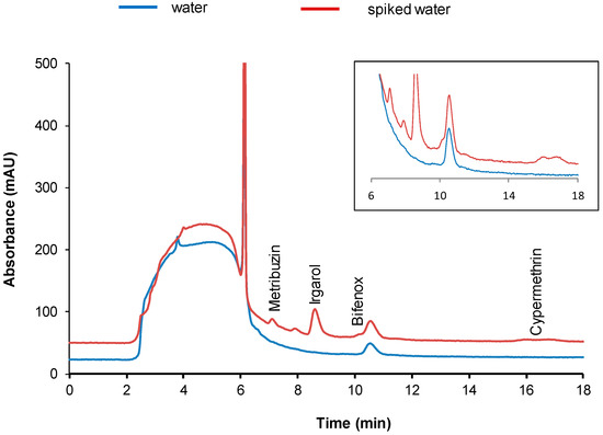Chromatograms obtained under the proposed conditions for a real water sample and the sample spiked with metribuzin, irgarol, bifenox (25 µg/L), and cypermethrin (125 µg/L).