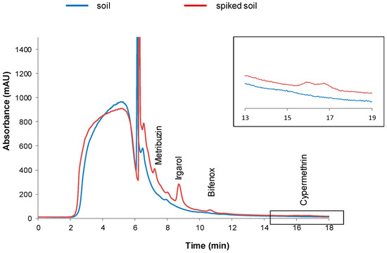Chromatograms obtained under the proposed conditions for the extract obtained from a soil sample and the same sample spiked with metribuzin, irgarol, bifenox (25 ng/g), and cypermethrin (40 ng/g).