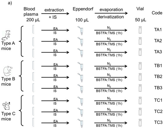 Diagram of the preparation of (a) test samples and (b) quality control samples. The sample code was indicated in every vial. The sample codes for the test samples (T) include information about the type of mice (A, B, or C) and the specimen number (1, 2, or 3). The codes of the quality control samples (QC) indicate the spiked concentration (50, 25, 10, 05, or 00) in μg/mL. (EA: ethyl acetate; IS: internal standard; BSTFA/TMS: silylation reagent).