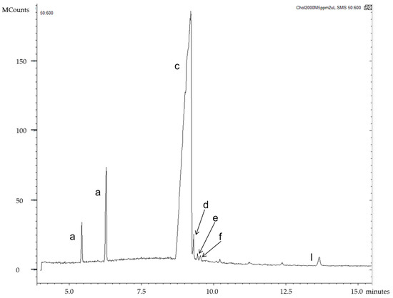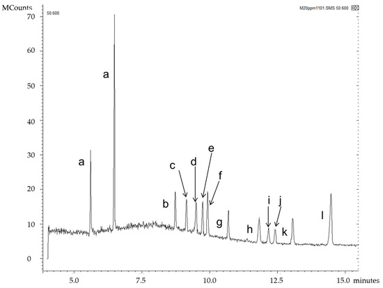 Chromatogram of a multi-standard solution (20 μg/mL in terms of each standard) to determine the retention time and the m/z ions of each Chol-related compound. The letters used to refer to the peaks mean the following: (a) BSTFA/TMS (silylation reagent); (b) 7α-hydroxycholesterol; (c) cholesterol; (d) desmosterol; (e) lathosterol; (f) 7β-hydroxycholesterol; (g) lanosterol; (h) 24(S)-hydroxycholesterol; (i) 25-hydroxycholesterol; (j) 7-ketocholesterol; (k) 27-hydroxycholesterol; (l) betulin (IS). The same letter codes are used in the rest of the manuscript.