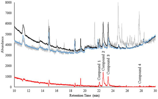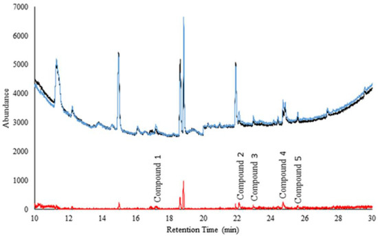Figure 1 shows the comparison of averaged chromatograms of headspace over (n = 50 and n = 50) nasal swab samples from ‘sick’ and ‘healthy’ cattle. The difference (shown in red) illustrates the preliminary separation of disease markers.