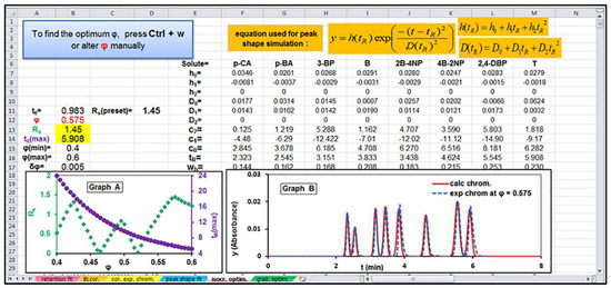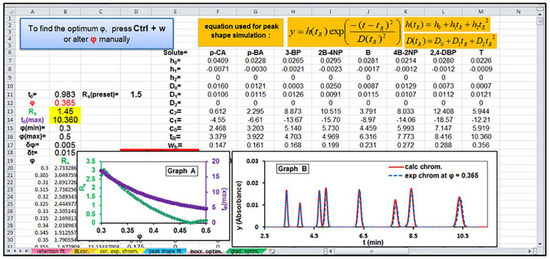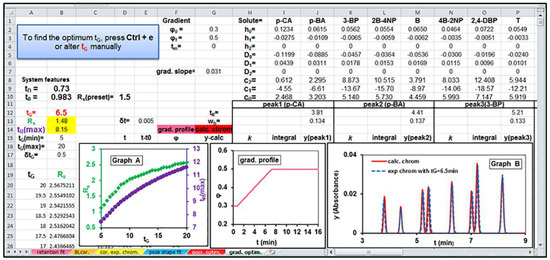 The values of ϕ0 and ϕf—i.e., ϕ0 = 0.3 and ϕf = 0.5 for the data set analyzed—are placed in cells G2 and G3, respectively, the features of chromatographic system—i.e., the values of tD = 0.73 min and t0 = 0.983 min in cells B9 and B10—whereas the estimated retention and peak shape parameters of all solutes are transferred in cells I2:Q10. Note that, in this procedure the retention adjustable parameters, c0, c1, and c2, were determined in the worksheet ‘retention fit’ from initial isocratic conditions. In contrast, the peak shape parameters, h0, h1, h2, D0, D1, and D2, were obtained from gradient runs between ϕ0 = 0.3 to ϕf = 0.5 with different gradient durations, tG = 5 and 20 min, in the worksheet ‘peak shape fit’, since the peak widths in gradient elution are normally compressed compared to those obtained under isocratic conditions. By pressing Ctrl+e, the minimum resolution, Rs, and the maximum of tR values, tR(max), of all solutes separated under gradient conditions with different gradient durations, tG, are calculated in columns A, B, and C, where tG, varied between two values, tG(min) = 5 min and tG(max) = 20 min, defined in cells B15 and B16 with a selected interval δtG = 0.5 min (placed in cell B17). Moreover, a plot is simultaneously created with these values of Rs and tR(max) vs. tG, as well as a graph is generated for simulated chromatograms obtained under different gradient profiles. Again, the execution of the macro is accomplished by finding the optimal gradient duration, tG = 6.5 min, which leads to the best separation of the sample—i.e., the separation with a satisfactory resolution, i.e., Rs = 1.5 (preset in cell D10)—in the shortest separation time, which in this case is only 8.15 min. The inset Graph B of Figure 3 depicts a perfect similarity between the predicted/simulated chromatogram in the optimal gradient elution with a duration tG = 6.5 min (plotted as the red solid line) and the original experimental one (plotted as the blue dashed line).