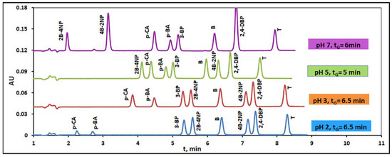 The same optimization approach is applied to chromatographic data obtained under isocratic conditions as well as under single linear ϕ-gradients in other examined eluent pHs—i.e., at pH = 2, 5 and 7, respectively—depicted in Table S1. The retention data recorded in eluent pH = 9 were not analyzed by means of the above spreadsheet optimization program since peak shape distortions appeared for some solutes at that mobile phase pH. The optimal conditions found for the separation of test mixture of solutes on the Kinetex 5 µm EVO C18 column in different eluent pHs are summarized in Table 1. The chromatograms recorded under the optimal gradient conditions found by the optimization algorithm are depicted in Figure 4. In the same Figure, the influence of mobile phase pH on the elution order as well as on the peak shape of ionizable compounds is also illustrated.
