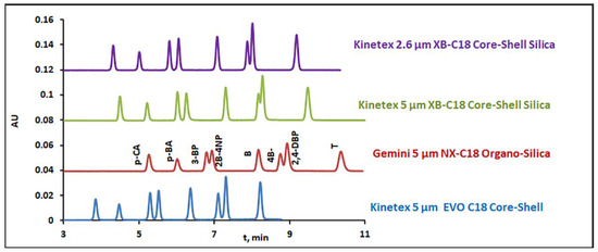 Once the optimal separation conditions of the sample of interest were found for the Kinetex 5 µm EVO C18 column by the proposed Excel-spreadsheet-based software, the effectiveness of the same optimal conditions into separation of solutes in different reversed-phase-type columns of the same size was tested. Indeed, a perfect resolution of the sample of interest is achieved in the chromatograms recorded in different columns under the optimal conditions determined for the Kinetex 5 µm EVO C18 column; see, as an example, Figure 5 for the application of optimal gradient conditions determined at eluent pH 3. Consequently, the optimal conditions derived for the separation of a sample on a certain column by the optimization algorithm could be successfully applied to other columns of the same type and size. Moreover, in Figure 5, the superiority of the core–shell technology columns and especially of the Kinetex EVO column is illustrated, since it is clear that a complete separation of test compounds was achieved within the minimum run time.