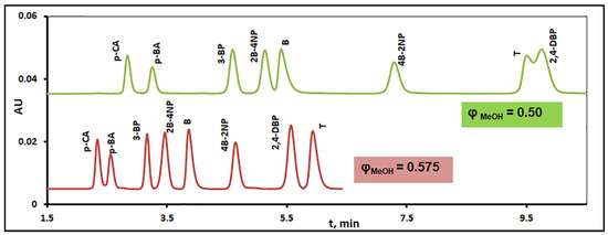 The importance and the advantages of performing a computer-aided separation optimization are clearly shown in Figure 6 and Figure 7. Figure 6 is a screenshot of the MS Excel spreadsheet ‘isocr. optim.’ used for isocratic separation optimization of test solutes in eluent pH 3 modified with MeOH. The retention data recorded in this eluent, depicted in Table S1, were analyzed by means of the Excel-spreadsheet optimization program following a procedure similar to that described above for separation optimization in eluent pH 3 modified with ACN. The optimal eluent, ϕMeOH= 0.575 was automatically found by pressing Ctrl+w. However, the selection of the optimal separation conditions is also possible from a good appreciation of the inset Graph A of Figure 6, which is also automatically created as described above. As shown in this figure, tR(max), decreases with increasing organic content ϕ in the mobile phase (purple circle markers), as is expected for a reversed-phase-type elution. However, the dependence of Rs (the resolution of the least resolved pair of adjacent solutes) on ϕ (depicted by the green diamond markers) is rather peculiar. For example, the resolution in mobile phases with either ϕMeOH = 0.46 or ϕMeOH = 0.52 is almost zero, which means that at least two solutes co-elute under the above isocratic conditions even though the run times, i.e., the values of tR(max) correspond to these eluent concentrations are longer than that in the optimal eluent with ϕMeOH = 0.575. Consequently, the foreknowledge of the precise dependence of Rs and tR(max) upon ϕ, provided by Excel-spreadsheet-based software adopted in this study and not by a trial-and-error method gives chromatographers a feel of confidence for the selection of the optimal conditions for a desired separation. Indeed, Figure 7 depicts a perfect resolution of the test solutes in the chromatogram recorded on the Kinetex 5 µm EVO C18 column and in the optimal eluent with ϕMeOH = 0.575. In contrast, the resolution of the same sample in a mobile phase with ϕMeOH = 0.5 is worse than that in an eluent ϕMeOH = 0.575 even though the separation time is longer, see also Figure 7.