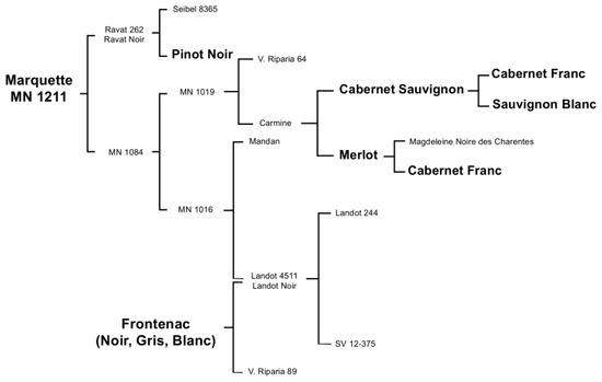 Pedigree of Frontenac and Marquette cultivars. Parentage of Marquette includes Pinot Noir, Cabernet Sauvignon, Merlot, Cabernet Franc, and Sauvignon Blanc. Marquette and Frontenac share common parentage (about 70%). This figure is adapted from pedigree maps from Chateau Stripmine [31,32].