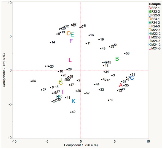 Principal component analysis (PCA) was performed on the 58 VOCs found in all wine samples (Figure 2). Please refer to Table 2 for compound identification. Wine produced from Frontenac berries harvested at 22° Brix (F22-1, F22-2, and F22-3) is associated with higher levels of 1-octanol (compound 35), ethyl laurate (compound 53), methylbutanal (compound 8), undecane (compound 31), and ethyl tetradecanoate (compound 56). Wine produced from Frontenac berries harvested at 24° Brix (F24-1, F24-2, and F24-3) is associated with higher levels of ethyl isobutyrate, ethyl-3-methylbutanoate, ethyl lactate, and 1-hexanol. Wine produced from Marquette berries harvested at 22° Brix (M22-1, M22-2, and M22-3) is associated with higher levels of acetaldehyde, ethyl butyrate, 1-hexanol, isoamyl butyrate, and 1-nonanal. Wine produced from Marquette berries harvested at 24° Brix (M24-1, M24-2, and M24-3) is associated with higher levels of ethyl hexanoate, propyl octanoate, and isobutyl acetate.