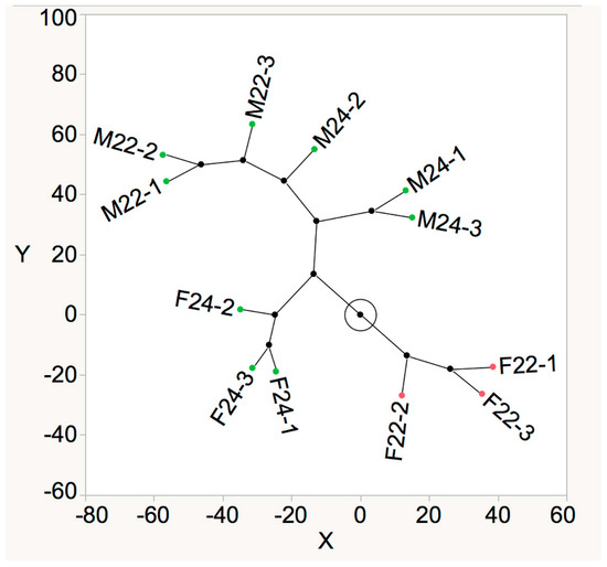 A constellation plot showing similarities in aroma compounds in Marquette and Frontenac wines produced from berries harvested at 22° and 24° Brix. The wine samples are arranged as endpoints and each cluster joins as a new point, with lines drawn representing membership. The longer the line, the greater the difference.