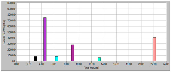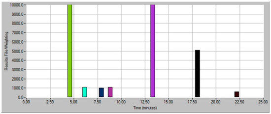 Marquette wine made from grapes harvested at 22° Brix had 14 aroma notes (excluding ethanol at 3.9 min) in the undiluted sample. After ADA (Figure 4), two events were calculated and identified as the most impactful to the total aroma profile of the wine: (1) 13.3 min, OD 8; and (2) 6.6 min, OD 2. The event at 3.9 min is ethanol, present in all samples, and therefore not included in the further discussion. These two aroma events corresponded to retention times of compounds simultaneously identified by mass spectrometer: (1) ethyl hexanoate; and (2) ethyl isobutyrate.