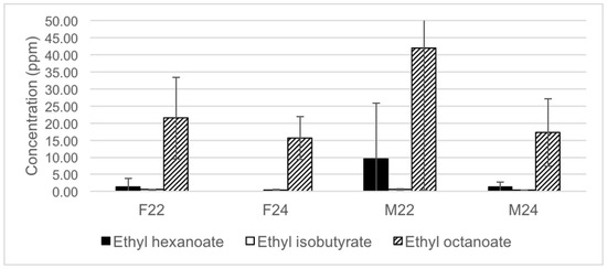 Marquette wines made from grapes harvested at 22° Brix had nine more aroma notes than grapes harvested at 24° Brix. The most impactful compounds as determined by ADA were ethyl hexanoate and ethyl isobutyrate (both from 22° Brix grapes); and ethyl decanoate and ethyl butyrate, both from 24° Brix grapes. Published aroma descriptors for ethyl hexanoate are apple peel and fruit, sweet and rubber for ethyl isobutyrate, grape for ethyl decanoate, and apple for ethyl butyrate [35]. Frontenac wines made from both harvest points had six aroma notes each. The most impactful compounds as determined by ADA were ethyl hexanoate and ethyl octanoate (both from 22° Brix grapes); and ethyl octanoate, ethyl decanoate, 1-pentanol, and ethyl isobutyrate from 24° Brix grapes. Published aroma descriptors for ethyl octanoate are fruit and fat, balsamic for 1-pentanol [35]. An external calibration was used to quantify ethyl hexanoate, ethyl isobutyrate, and ethyl octanoate, and OAVs were calculated. The most impactful aroma compound with calculated OAV >50,000 was ethyl isobutyrate contributes a fruity aroma.