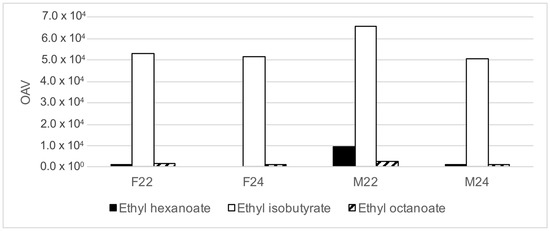 Odor (aroma) activity values of target analytes in headspace of Marquette and Frontenac wines made from berries harvested at 22° and 24° Brix. Odor detection thresholds for each analyte in water (and wine when available) from Leffingwell and Associates [33] were used to calculate OAV. OAV is the ratio of analyte concentration to its odor detection threshold. Ethyl octanoate is the dominate aroma compound present in headspace of Marquette and Frontenac wine samples (excluding alcohol), followed by ethyl hexanoate and ethyl octanoate. These compounds impart fruity aromas to the wine samples.