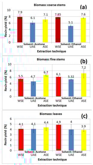Comparison of average solvent extraction yields in resin (% on the biomass amount), n = 3. Solvents: acetone or ethanol. (a) biomass: coarse stems; (b) biomass: fine stems; (c) biomass: leaves. WSE: warm solvent extraction; UAE: ultrasonic-assisted extraction; ASE: accelerated solvent extraction.