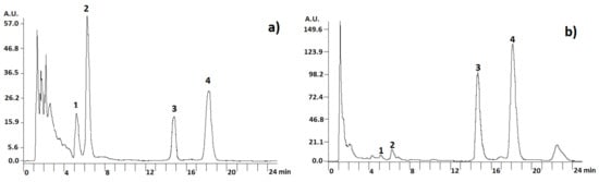 Guayulins A, B, C and D in resin extracts from (a) Guayule leaves (sample L1, extraction solvent: acetone) and (b) Guayule coarse stems (sample CS2, extraction solvent: ethanol). Peak attribution: 1—guayulin D; 2—guayulin C; 3—guayulin B; 4—guayulin A. A.U. = arbitrary units.