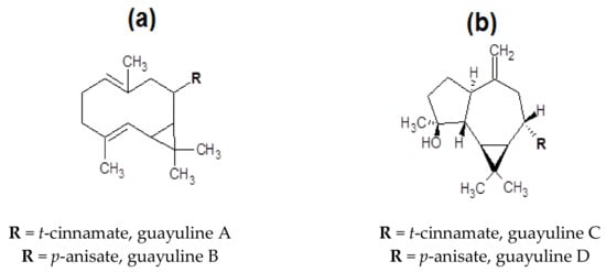 Guayule resin is usually obtained from the extraction by the ground whole shrub or the coagulated latex with polar solvents, usually acetone [5]. Despite the fact that it is often not valorized and hence discarded, resin is a very interesting fraction from both an academic and an industrial point of view. Indeed, it is not only rich in sesquiterpenoids and triterpenes of potential commercial value [6], it also contains a variety of interesting secondary metabolites of the shrub, like guayulins [6,7,8]. Guayulins A ((1R,2S,4Z,8Z,10S)-4,8,11,11-tetramethylbicyclo[8.1.0]undeca-4,8-dien-2-yl(2E)-3-phenylprop-2-enoate) and B ((4Z,8Z)-4,8,11,11-tetramethylbicyclo[8.1.0]undeca-4,8-dien-2-yl 4-methoxybenzoate) are respectively the cinnamic and anisic esters of the partheniol ((1S,2E,6E,9S,10R)-3,7,11,11-tetramethylbicyclo[8.1.0]undeca-2,6-dien-9-ol) [7], whereas the guayulin C ((1AR,1BR,2R,4AR,7S,7AR)-2-hydroxy-1,1,2-trimethyl-5-methylidene-decahydro-1H-cyclopropa [E]azulen-7-yl (2E)-3-phenylprop-2-enoate) and guayulin D ((1AR,1BR,2R,4AR,7S,7AR)-2-hydroxy-1,1,2-trimethyl-5-methylidene-decahydro-1H-cyclopropa[E]azulen-7-yl 4-methoxybenzoate) are likely formed by the oxidation of the guayulines A and B, respectively [6,8]. Scheme 1 reports the structures of these molecules.