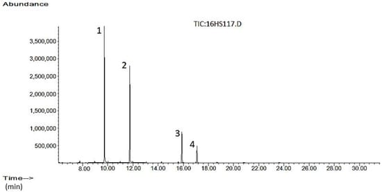 Retention times of endocrine disrupter chemicals (EDCs). 1: TMS-4NP, 2: TMS-BPA, 3: TMS-E2, 4: TMS-EE2.