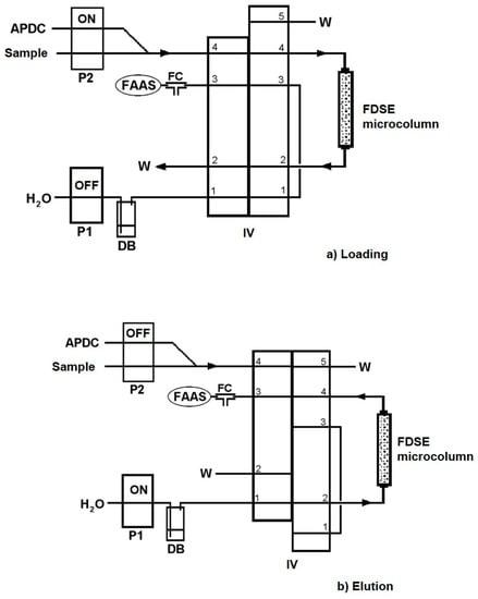 - Giakisikli, G.; Ayala Quezada, A.; Tanaka, J.; Anthemidis, A.N.; Murakami, H.; Teshima, N.; Sakai, T. Automatic On-line Solid-phase Extraction—Electrothermal Atomic Absorption Spectrometry Exploiting Sequential Injection Analysis for Trace Vanadium, Cadmium and Lead Determination in Human Urine Samples. Anal. Sci. 2015, 31, 383–389. [Google Scholar] [CrossRef] [PubMed]