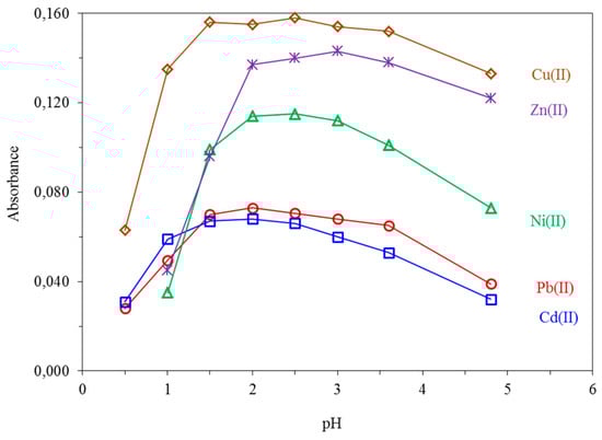 | Regression equation | A = 0.0149 [Cu(II)] + 0.0025 | A = 0.006 [Ni(II)] + 0.0022 | A = 0.0223 [Zn(II)] + 0.0034 | A = 0.0013 [Pb(II)] + 0.0045 | A = 0.0062 [Cd(II)] + 0.0016 |