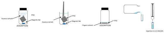 FPSE is a simple sample preparation technique consisting of only two main steps: (1) sample extraction, in which the sample is put in contact with the FPSE media and analytes are retained in the sorbent; and (2) solvent desorption, where FPSE media is submerged in a small volume of organic solvent and analytes are back-extracted to this solvent. Figure 1 shows the general procedure applied in FPSE extraction.