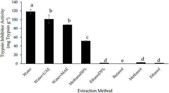 As shown in Figure 1, the TIA values of all the aqueous extracts were significantly higher than for the organic solvent extracts. This is due to trypsin inhibitors being polypeptides, which are likely to be more soluble in aqueous media than in organic solvents [5,6,7].