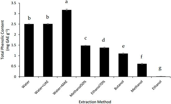 Total phenolic content of defatted Gac seed extracts affected by extraction method. The values are the mean of three replicates for each extraction. Columns not sharing the same superscript letter are significantly different at p < 0.05. GAE: gallic acid equivalents.