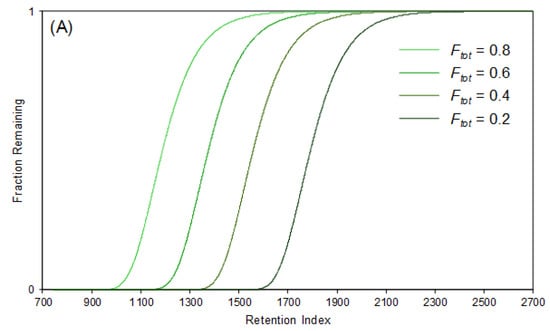 The evaporation rate constants predicted by the models can be used to determine the fraction remaining of an individual compound at a given retention index (FIT). As an example, for the variable-temperature model, FIT is obtained by substituting Equation (7) into Equation (1) and rearranging, as shown in Equation (8),