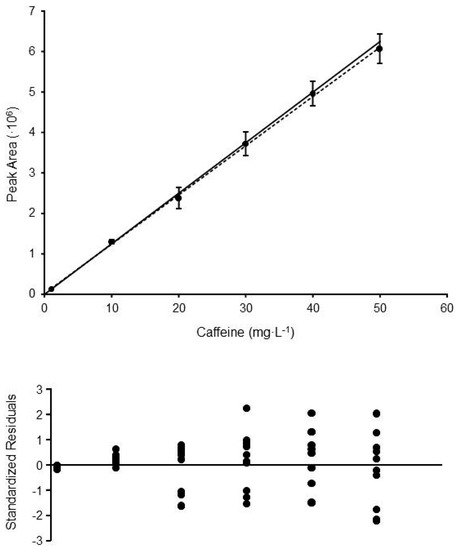 Calibration curve and standardized residuals plot obtained for the method HPLC-UV#3 (determination of caffeine in coffee samples). Each calibration point is the mean of 8–10 replicate standards prepared and measured in different days. The error bars show the standard deviations obtained at each level. Solid line shows the linear trend obtained applying OLS (y = 121,810x + 224,242; R2 = 0.99926), whereas the dashed line corresponds to the linear trend obtained by WLS (y = 124,904x + 1678; R2 = 0.99896).