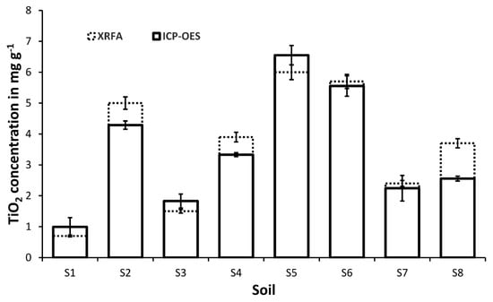 Ti-concentrations in soil measured using XRFA and ICP-OES (expressed here in terms of TiO2) were similar for all soils expected for S2, S4, and S8, where the values obtained using XRFA were slightly higher. The TiO2-concentration range was 0.07–0.7 mg g−1 (Figure 2), which is in concordance with values measured for other European topsoil’s and floodplain sediments [16]. Soils rich in clay S5 and S6 had the highest values; whereas the sandy soils S1, S3, and S8 and S7 (peat) had the lowest concentrations. The concentrations of further elements were determined using XRFA (Tables S1 and S2). Remarkable features were the high Ca-content of S2 (14.4 mg g−1) compared to the other soils (<4 mg g−1), the high Zr-content of S8 (614 µg g−1) compared to other soils (57–276 µg g−1), and the high Mn and S concentrations for S7 (0.42 and 1.28 mg g−1, respectively).