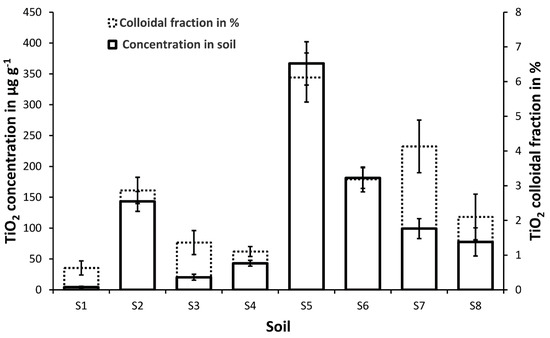 Inspired by previously developed methods for extracting nanoparticles from soil [14,15,19,21,24,25], we investigated 8 soils, which differ in terms of grain size distribution, organic matter content, and origin (river sediments, forest soil, agricultural soils, peat, native tropical soil), for their Ti-content. To estimate the relevance of the silicate-bound and colloidal fractions of the Ti-containing particles, we determined the total Ti-concentration (X-ray fluorescence analysis, XRFA), the acid-soluble fraction (inductively coupled plasma optical emission spectrometry, ICP-OES), and the colloidal fraction (extraction and ICP-OES). Furthermore, we analyzed the particles containing Ti in soils and colloidal extracts using electron microscopy and hydrodynamic chromatography coupled with ICP-MS (HDC-ICP-MS) for size and composition determination. We also discuss possible implications of our findings for the development of analytical methods dedicated to the detection of engineered TiO2 nanoparticles in soils.