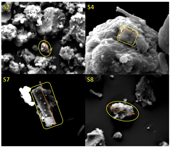 The presence of large Ti-containing particles in the investigated soils was confirmed using SEM imaging combined to EDX analyses for all soils except S1 (commercial sand). We observed a large variety of shapes from crystalline (typically elongated crystals as in S7, Figure 4) to irregular shapes (Figure 4 and Figures S2–S5). The particle size range was 1–100 µm, with large variations for some samples. The determination of the complete size distribution was not possible due to the limited amount of observed particles. EDX analyses revealed that most particles contained only Ti and Oxygen as main elements (see S7, Figure S6, for a representative example). Some particles observed in S8 (tropical native soil) contained Fe in addition to Ti, (see S8, Figure S7) which may have corresponded to Fe-Ti minerals such as Ilmenite.