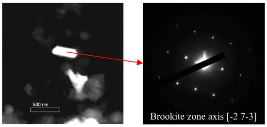 The pre-concentration step enabled imaging and identification of ten Ti-containing particles. Their size range was 0.1–1 µm. Interestingly, most particles were observed as elongated monocrystals, albeit irregular and spherical shapes could be observed as well (Figure 5). The electron diffraction pattern of one of these crystals corresponded to the brookite structure (Figure 6), which is common in nature [17]. It was impossible to do an electron diffraction pattern on the other nanocrystals due to the contribution of the surrounding soil particles to the total diffraction pattern. All observed Ti-containing particles exclusively contained Ti and O, and could be clearly distinguished from clays, quartz, and iron oxides particles (Figure 7 and Figures S8 and S9).