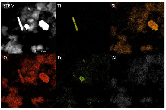 Owing to the limited resolution and the high number of silicate particles, Ti-containing particles smaller than one micrometer could not be imaged using SEM analysis. To characterize this fraction, a colloidal extraction was conducted. The extraction method used in this study was a combination of previously reported methods for extracting nanoparticles from soil [14,15,19]. We used the combination of surfactant and ultrasound treatment for dispersing soil colloids before centrifugation. The only innovation with respect to previous works was the addition of NaOH in the extracting medium. The high pH value contributes to the stability of most soil colloids, while the presence of sodium cation improves the dispersion of clay minerals [30]. The cut-off of this extraction was estimated to be around 1.2 µm for a spherical averaged soil particle. However, the estimation of such cut-off is always uncertain due to the high diversity of soil particles. Therefore, the cut-offs reported in this study were rather indicative.