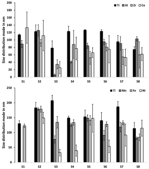 Interestingly, the size distribution modes for Ti and Al differed significantly for most of the investigated soils (Figure 8), which is in accordance with our previous conclusion that the main Ti-fraction is not included in clays. Similarly, it seems that Zr and Ce containing particles are not always included in Ti-containing particles. However, Zr and Ce, when detected, have the same size mode. Therefore, we cannot exclude that these elements are part of the same minerals. Furthermore, size modes for Mn, Fe, and Ni, when detected, were similar to the Ti ones for S1, S2, and S5, whereas they differed significantly for the other soils. This suggests the absence of a systematic link between colloids containing Ti and other main elements found in soils. However, the adsorption of ions (Fe, Mn, Ni, etc.) on the surface of TiO2 particles cannot be ruled out and is probable [38,39]. Nonetheless, this would most probably not result in a significant contribution to the ICP-MS signal compared to the particulate form, considering the low signal intensity, except for Al (clays) which were present in much higher concentrations than other particles in all soils.