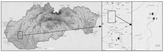 River sediments and waters with negligible background levels of studied pollutants were obtained from three different localities within the catchment area of Vah River (Slovak republic). Sediments were sampled from Dudvah River (N 48° 20′ 54.76″; E 17° 44′ 23.58″), Vah River nearby the mouth of Dudvah River to Vah River (N 48° 21′ 10.55″; E 17° 44′ 59.62″) and from the water reservoir Kralova near the city of Sala (N 48°12′ 35″; E 17° 48′ 02″). A map describing the location of individual sampling sites is depicted in Figure 1. Sediments were collected from the sediment surface (0–10 cm) at least 1 m away from the riverbank. At each site, four samples of sediment were obtained from sampling points forming the edges of the imaginary square with the side length of approximately 0.5 m to ensure the qualitatively and quantitatively representative samples. After removal of small stones and plant residues, sediments were homogenized by quartering and dried at laboratory temperature (23 ± 2 °C), gently crumbled, sieved through a 0.31 mm mesh and stored dry at laboratory temperature. For the extension of studied objects as well as in terms of comparative study, the river sediments were washed three times in deionized water or 0.1 mol dm−3 HCl solution during a 2 h agitation (250 rpm) at the concentration of sediment 200 g dm−3. In this way, a laboratory sea sand (fraction < 0.31 mm) as a model matrix was also used.