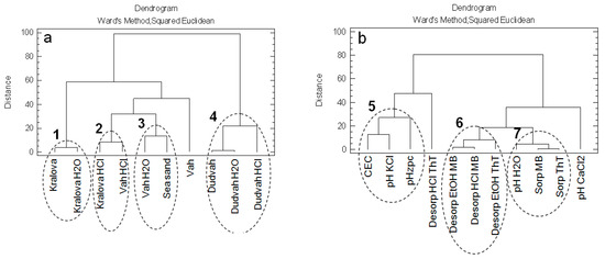 Dendrograms showing clustering of: (a) non-treated and treated river sediments and sea sand as studied objects; (b) physico-chemical characteristics of studied matrices and their sorption/desorption characteristics for dyes binding as obtained variables.