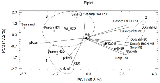 The main reason of PCA application was to identify the relationships in terms of positive or negative correlations between the obtained variables. In the evaluation of PCA results, the angle between the vectors representing variables plays an important role. If the angle between the vectors is too low, it represents a positive (synergic) correlation between the studied variables. If the angle is close to 180° and vectors lie on opposite sides, it represents a negative (antagonistic) relationship between the variables. No correlation between the studied variables is observed if the vectors form a right angle. On the basis of these rules, the positive correlations were found between pHH2O value and ThT sorption (1); pHCaCl2, MB sorption and desorption MB by 96% vol. ethanol solution (2); and pHKCl and CEC values (3). On the other hand, no correlation was determined between CEC or pHKCl and pHCaCl2, pHH2O or ThT and MB sorption. PCA was also used by Liu et al. [41] to apportion sources of polycyclic aromatic hydrocarbons (PAHs) in surface sediments of the Huangpu River in Shanghai (China), whereby parameters defining PAHs characteristics as well as coal combustion, traffic-related pollution and spills of oil products were included in the analysis.
