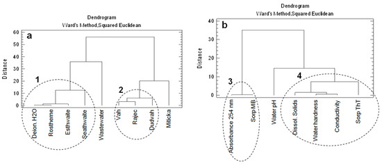 Dendrograms showing the clustering of: (a) studied waters (river waters, deionized water, synthetic lake waters, mineral waters, or synthetic wastewater) as environment of sorption experiments; (b) physico-chemical characteristics of studied waters and dye sorption onto studied matrices.