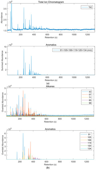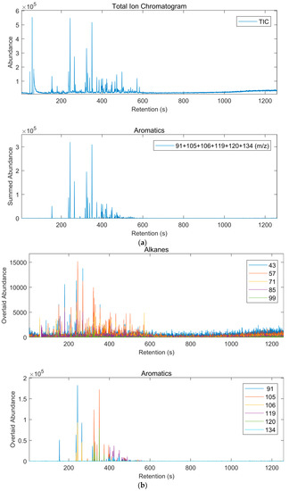 Sample of 1D GC-TOF data for the most abundant gasoline level tested (1.0 μL/mL) as: (a) TIC and summed aromatic EIC; and (b) alkane and aromatic EICs displayed as overlays of individual ion chromatograms.