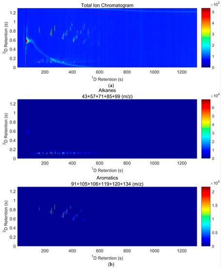 Sample of 2D GC×GC-TOF data for the most abundant gasoline level tested (1.0 μL/mL) as: (a) TIC; and (b) summed alkane and aromatic EICs. The 2D retention axis has been shifted downwards by 0.55 seconds in all figures to account for the 2D tm. EICs are not provided as overlays of individual ion chromatograms as it is not possible to present them in a meaningful way for the 2D data.
